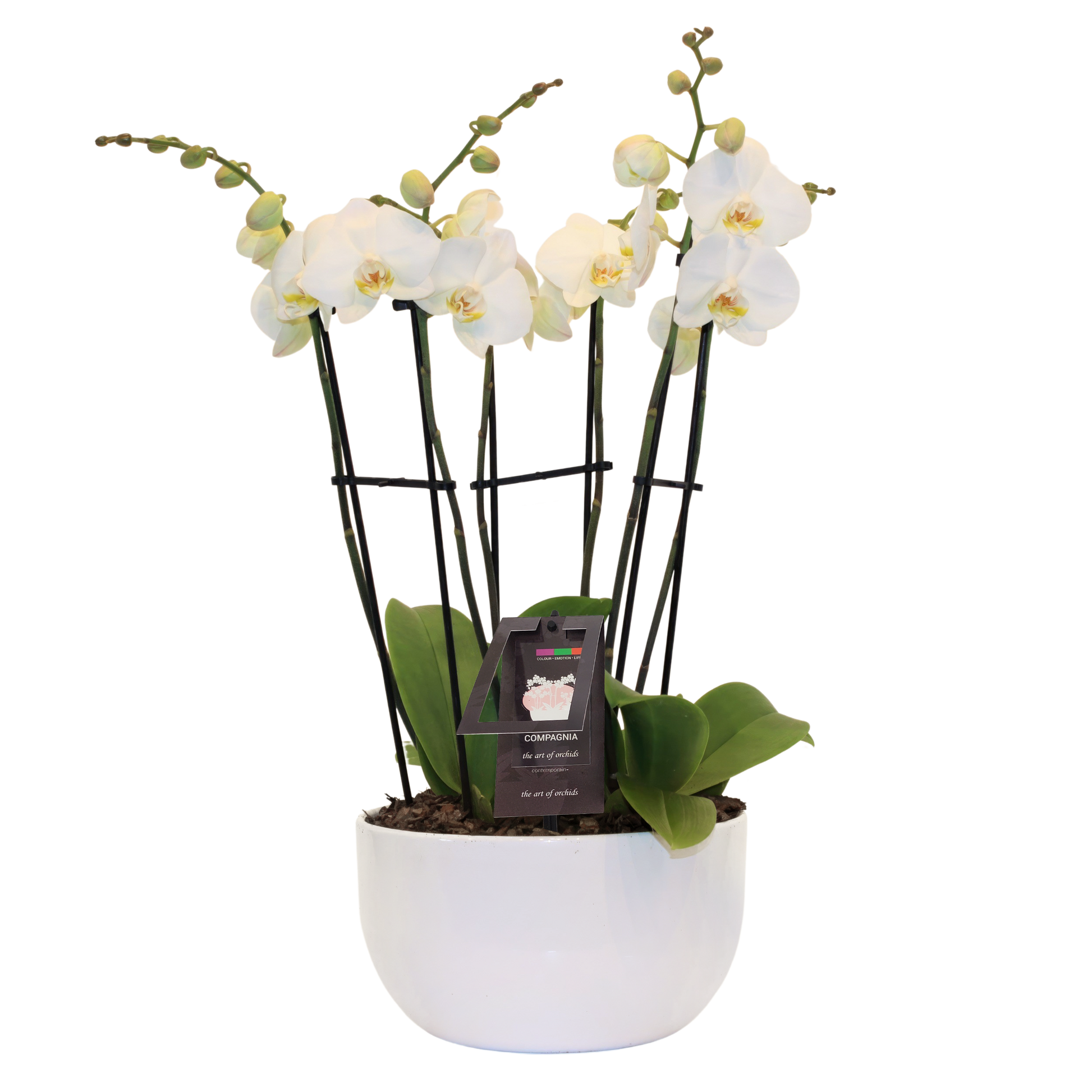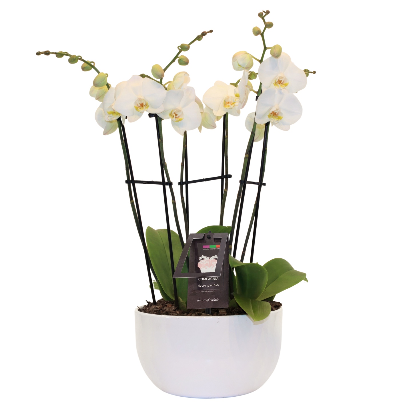 The gift of an orchid is elegant, timeless and beautiful. With elegant white blooms, three triple stemmed orchid is presented in a ceramic planter garnished with river rocks. It's a stunning and timeless gift choice that is sure to impress. Ceramic container finish & design may vary.