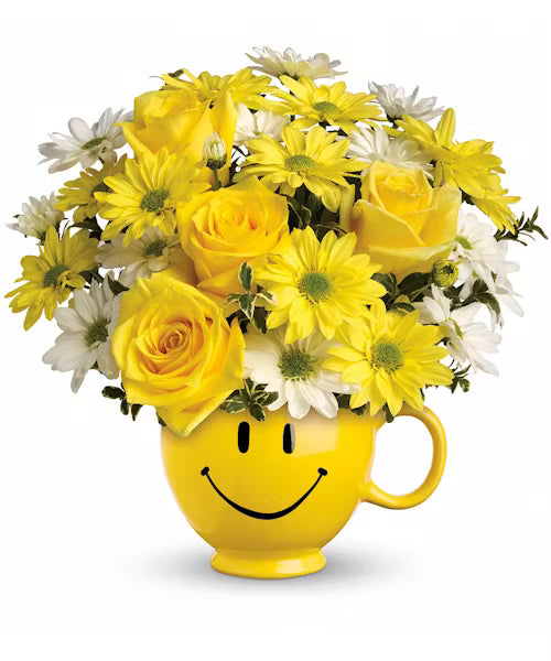 This happy bouquet has been a top seller for years. And for Classic reason... because it brings smiles to people. It's upbeat. The ceramic reusable coffee mug is clearly cheerful and the flowers inside are bright and uplifting. This bouquet includes yellow roses, yellow and white daisy spray mums and delicate oregonia greens.