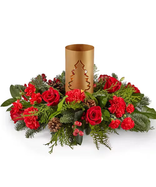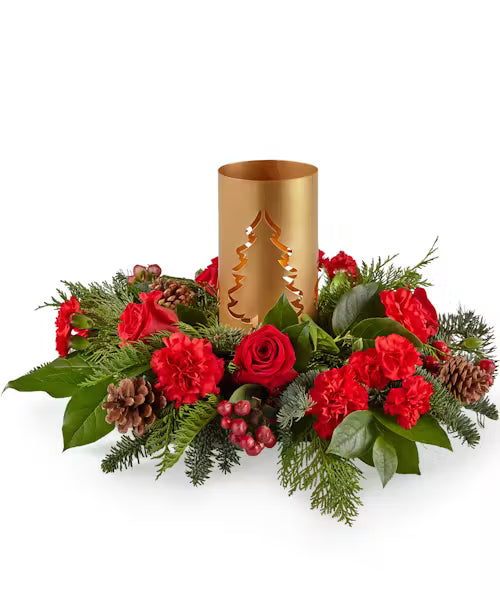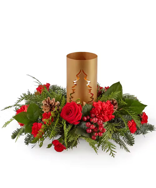 Add blustery cheer to any holiday table with this coniferous centerpiece studded with cardinal-red flowers and berries gathered around a glowing candlelit tree lantern.